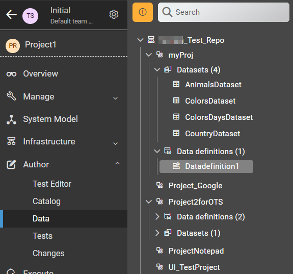 | Search | You can search for a Data definition or a dataset in a branch by entering the name of the Data definition or dataset in the Search field. |