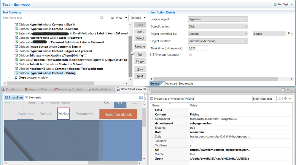 This part of the editor shows the details for each action in the test script. The data is automatically captured during recording. You can modify it to your needs. dataset is typically associated to the content captured in this part of the editor. You can also drag the objects from the screen capture in the SmartShot View to the User Action Details area for the tool to recognize the object and fill the fields automatically.