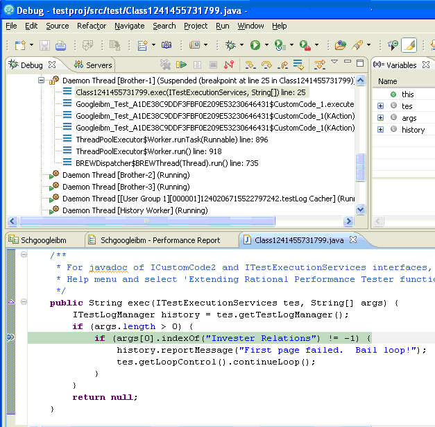 exec()method:ITestLogManager history = tes.getTestLogManager(); if (args.length> 0) { if (args[0].indexOf("Invester Relations") != -1) { history.reportMessage("First page failed. Bail loop!"); tes.getLoopControl().continueLoop(); } }Important:- Fix the double quotation marks, if any, so they are straight and the compiler no longer gives warning.