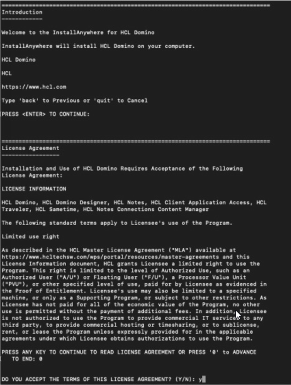 At the License Agreement screen, review the terms and accept by entering Y, followed by enter.