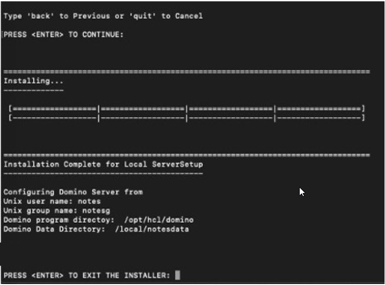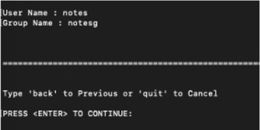 When prompted, enter the Username and Group names that were created for this server in the prerequisite step. The defaults are Username: notes, Group Name: notesg
