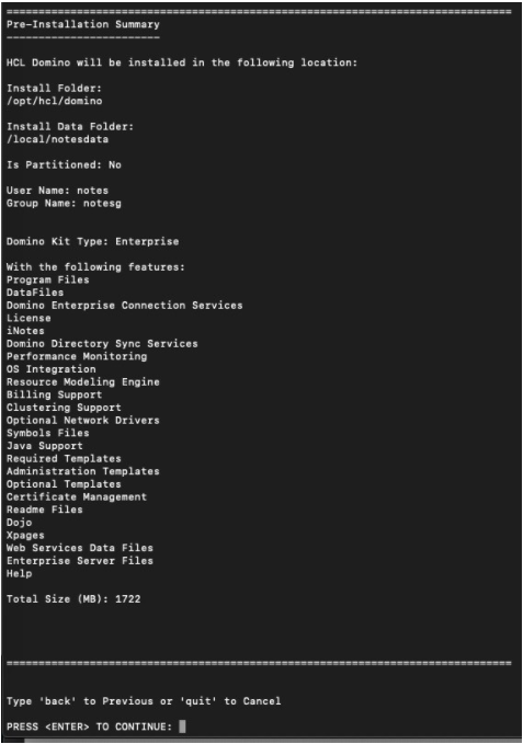 Choose a Program File Directory Name. Note: it is recommended to keep the default name /opt/hcl/domino. Press enter to continue.