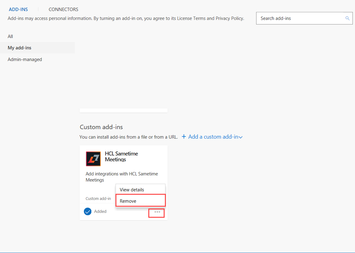 The uninstall the Sametime meetings add-in, users must remove the custom add-in the users added to Microsoft outlook.