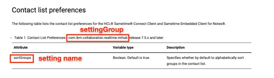 設定資料のページでは、一部の表に settingGroup の名前が示されています。たとえば、 チャット設定の表 2 はチャット履歴設定用です。settingGroup 名は com.ibm.collaboration.realtime.chat.logging です。この例で使用される設定は、「days.storage.max」と「logging.default」です。これにより、クライアント側のすべてのチャットを自動的にログに記録し、7 日間保持するようにユーザーのクライアントが構成されます。