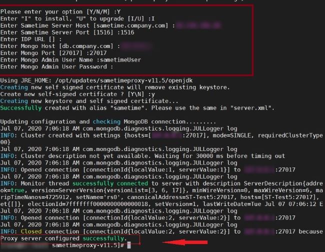 シンプルなプロンプトが表示され、Sametime コミュニティー・サーバーと MongoDB サーバーのアドレスが要求されます。