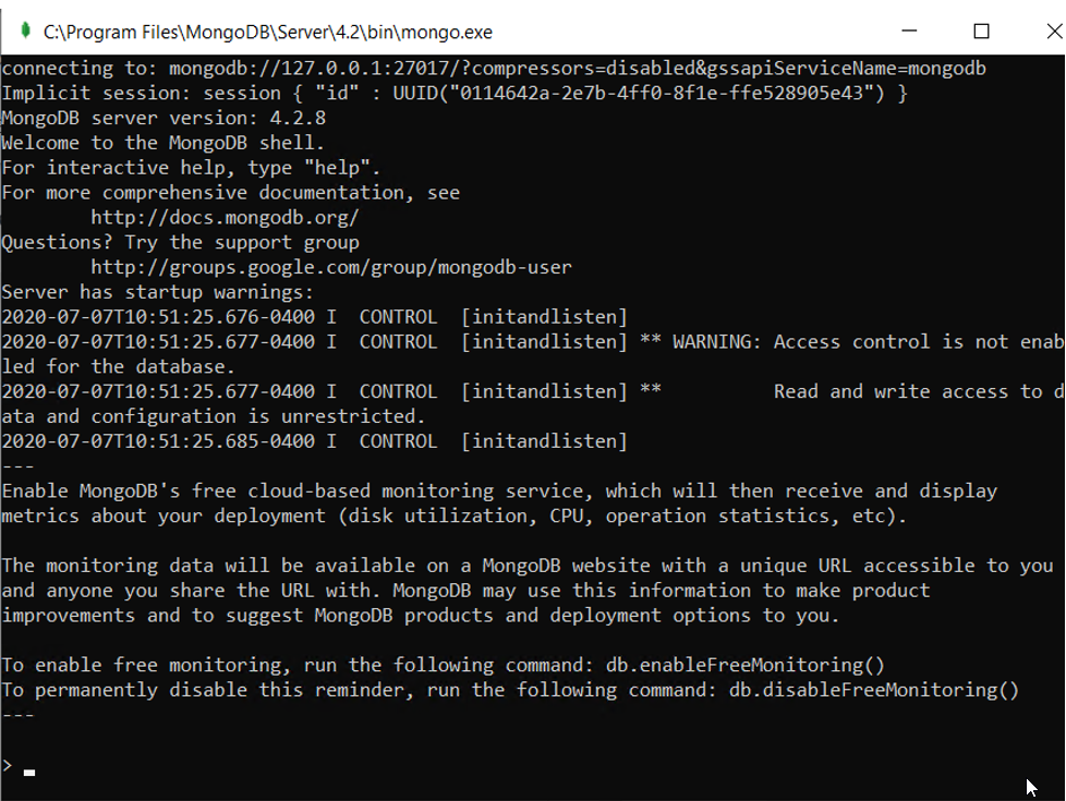 オプション: MongoDB コンソールを起動するには、コマンド・プロンプトを開き、 MongoDB install directory/bin フォルダーに移動して