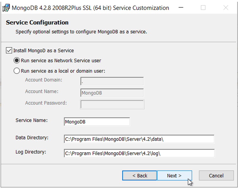 注: Windows サービスとして実行中の MongoDB を実行し、ネットワーク・サービス・ユーザーとして サービスを実行することをお勧めします。「サービス名」 、 「データ・ディレクトリー」 、 「ログ・ディレクトリー」 パラメーターは変更できますが、構成ステップ中にメモする必要があります。これらの手順は 4.2.8 に関する説明なので、必要に応じてデフォルトの 4.4 ディレクトリーを指定します。