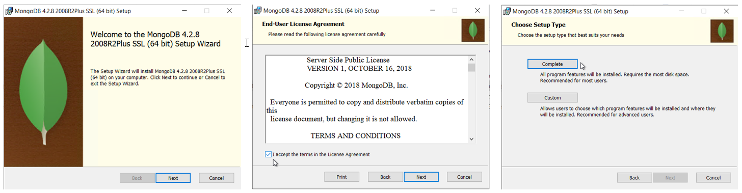 - MongoDB グラフィカル・ユーザー・インターフェース (GUI) に従ってインストールし、条件に同意し、完全なセットアップ・タイプを選択します。