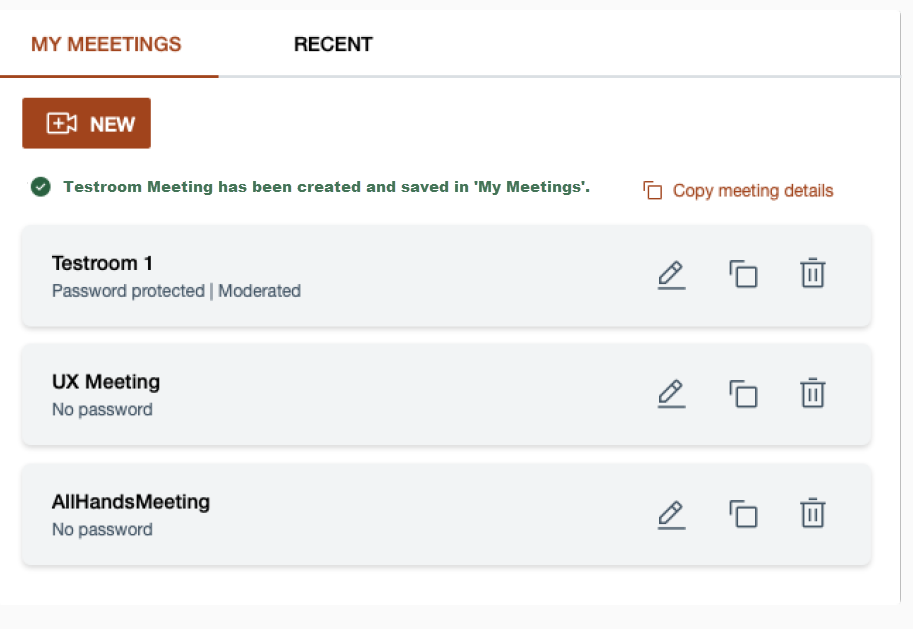 - ユーザーが「ミーティングのリンクを保存およびコピー」オプションをクリックすると、成功メッセージと「ミーティングの詳細をコピー」リンクが表示されます。
