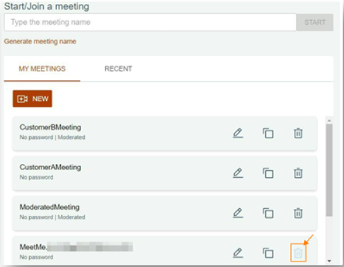 「自分主催のミーティング」タブを使用すると、所有者は自分のミーティングリストを作成してアクセスできます。ルーム所有者には、デフォルトのミーティングを含む現在のミーティングルームのリストも表示されます。すべてのミーティングは編集および調整可能です。所有者は、デフォルトのミーティングルーム以外のミーティングを削除することもできます。