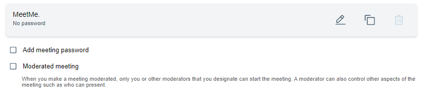 ミーティングパスワードを追加するように選択すると、モデレーター/所有者を含むすべての参加者がパスワードを入力してミーティングに参加する必要があります。このパスワードは「設定」ページには表示されないので、後から参照できるように必ず保管してください。