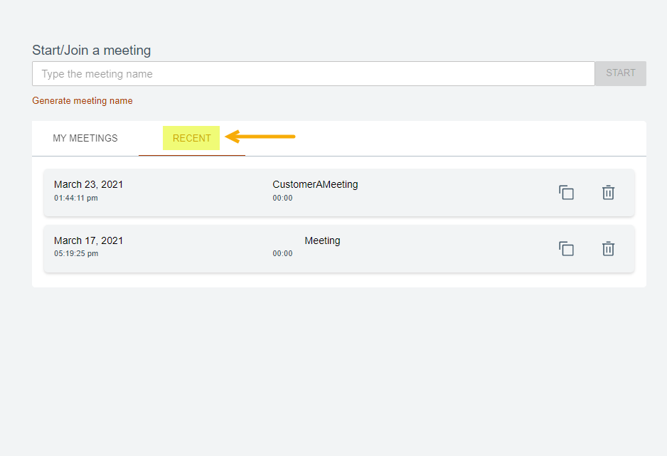「最近」タブにはユーザーが参加したミーティングがすべて一覧表示されます。このリストには、ユーザーがホストするミーティングと、他のユーザーがホストするミーティングが含まれます。ユーザーは、「最近」のリストから個別のミーティングを削除したり、リンクをコピーしたりすることができます。