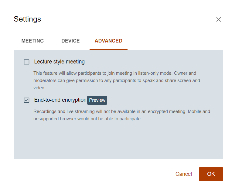 - エンドツーエンドの暗号化は、極めてプライベートな内部ミーティングにセキュリティ層を追加できるプレビュー機能です。 注: