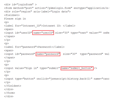 - The value in the name attribute of the Intranet ID label's input statement. This value is user ID.