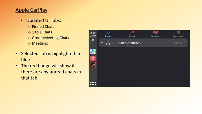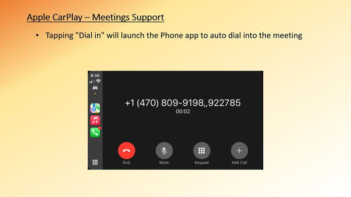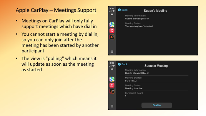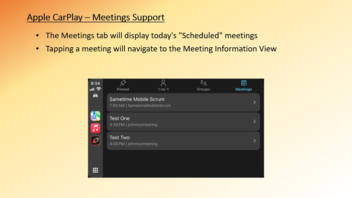 - When users join a meeting on CarPlay, they see with an active meeting screen while they attend the meeting. When they leave the meeting, Sametime returns them to the meetings list.