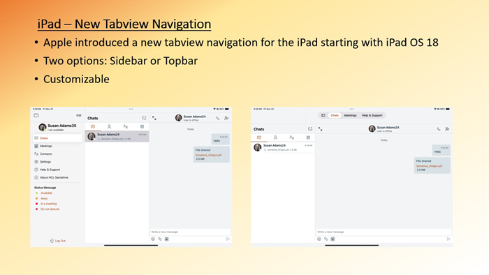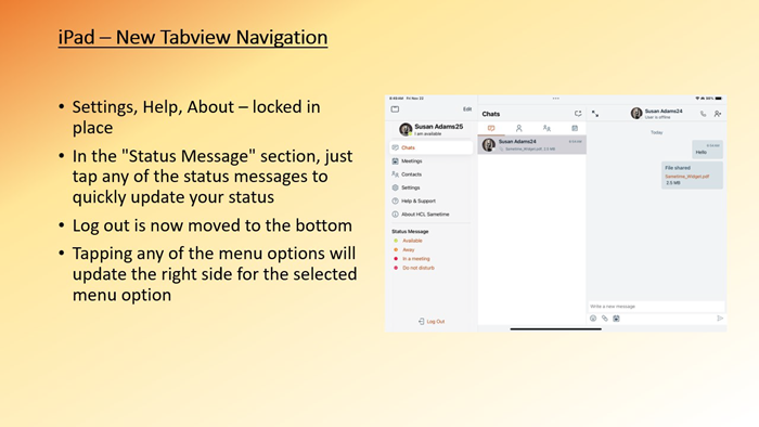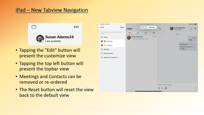 - Sametime now uses tabs to access Chats, Meetings, Contacts, and Settings.