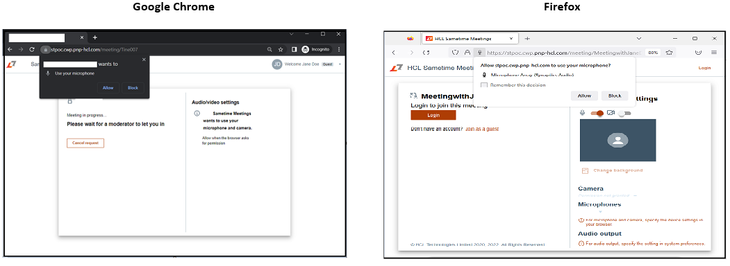 Follow the instructions on how to configure and allow browser access to your audio output, microphone, and camera. MacOS users must perform additional steps to allow screen share. Refer to MacOS additional steps for the details.