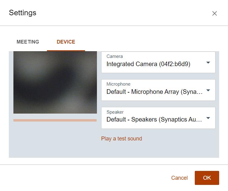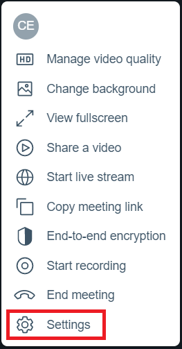 Users can make changes to their camera and microphone settings during a meeting. Scroll over the bottom of the meeting window and select the three dots for the settings. Select Settings. Depending on the user type and access level, the following options is displayed on the More Actions menu.