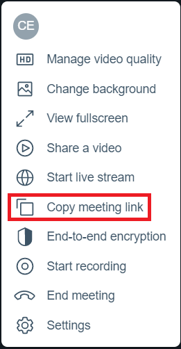 You need the meeting link or name in order to join or access the meeting. To copy the meeting link, scroll over the bottom of the meeting window and select the three dots for the menu. Depending on the user type and access level, the following options are displayed on the More Actions menu.
