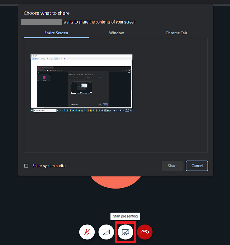 - Entire Screen—select this option to show your entire screen, including all open applications, browsers, and tabs.