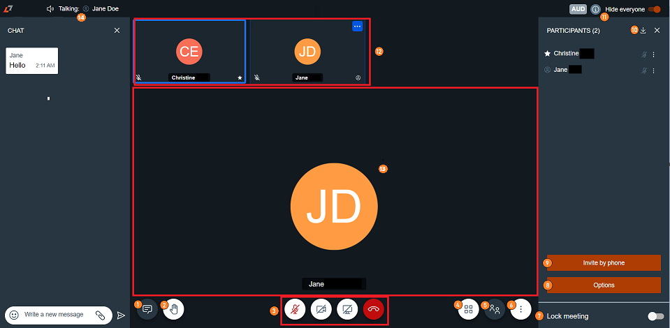 After joining a meeting, users see the following points in the meeting room. Some features can be configured based on user preference. Depending on the user’s role (owner, moderator, participant, or guest), some options may be unavailable.