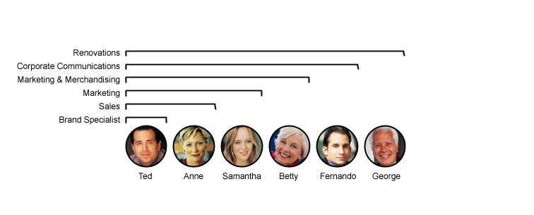 In the following examples, the Renovations company has assigned employees to the following user groups. Notice that many of the groups have other groups nested within them.