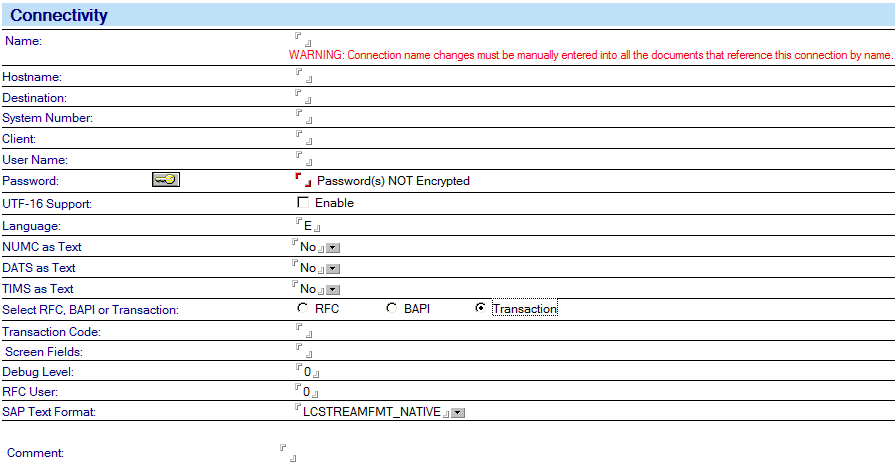 to be called. See below for details. If you select RFC or BAPI, the options are as follows: RFC or BAPI -- Enter the name of the RFC or BAPI that you want to call, for example,BAPI_CUSTOMER_GETDETAIL2 . Tables -- Click the down arrow to see a list of available tables in the RFC or BAPI that is specified in the "RFC or BAPI." Columns -- Displays the available columns based on the selected Table(s). If you select Transaction, the options are as follows: Transaction Code -- Enter the transaction code you want to call using batch mode processing, for example ME21 or XDO2. Screen Fields -- Enter the screens and their fields needed to call this transaction. Use this only when an R/3 transaction is the target. These define the transaction screens. The field definitions for each Screen used is defined by the program name with a leading ‘$’ and the Dynpro number as a value, this is followed by the input field names. If a field is assigned a value, the field is assumed to be constant. Blank lines are ignored. For example, for XD02, the list would be as follows: $SAPMF20D = 0101 RF02D-KUNNR RF02D-D0110=X BCD_OKCODE=/00, and so on. This is only a partial list. You must have a separate SAP connection document for each RFC, BAPI, or Transaction to be called. |