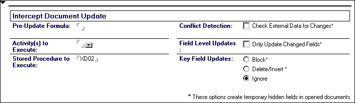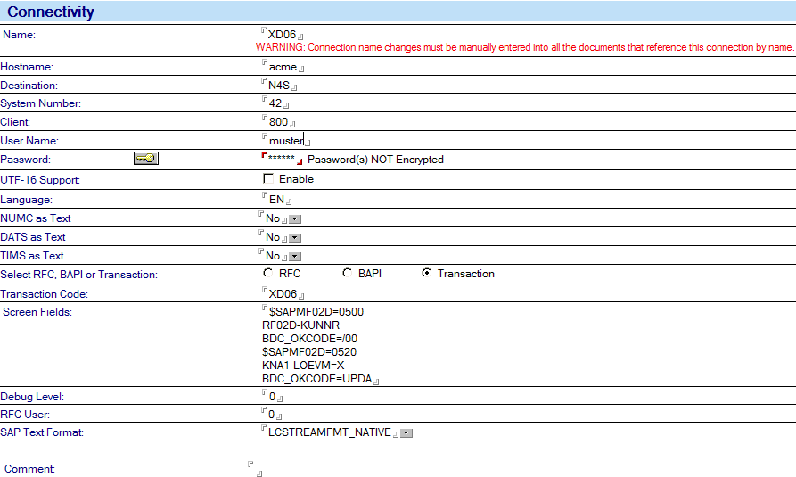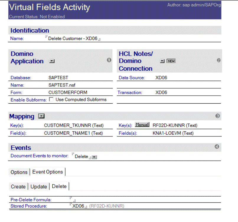 You must fill in the "Field" items even though they are not used. The field name acts as a placeholder within the activity document. The actual activity is driven by the screen fields defined in the connection document. That is why KNA1-LOEVM=X was set in the SAP connection document. Alternatively, you can place everything under the Key List; they will then be passed to the SAP Connector. In this case they are not really keys, they are only values passed to the transaction.
