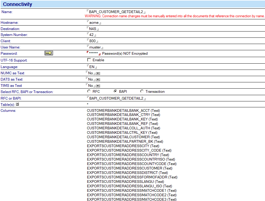 Under Table Name we have used the "*" character -- which means we want to be able to map from all tables AND imports. We need the Import Parameter CUSTOMERNO to be filled in as the key field value to determine which data is retrieved. Since we entered "*" under Table Name, we also see IMPORTSCUSTOMERNO and IMPORTSCOMPANYCODE when we do our mapping. Therefore, IMPORTSCUSTOMERNO is the key that we really want for this call.
