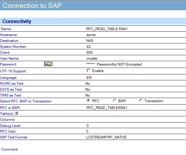 To enable this functionality, you need a properly configured SAP connection document. Complete the connection document fields as you would for any other RFC/BAPI, with one exception. In the field Function Module, instead of entering RFC_READ_TABLE, enter RFC_READ_TABLE with the name of the table you want concatenated to the end of it. For example, to read table KNA1 enter RFC_READ_TABLEKNA1 for the Function Module name.