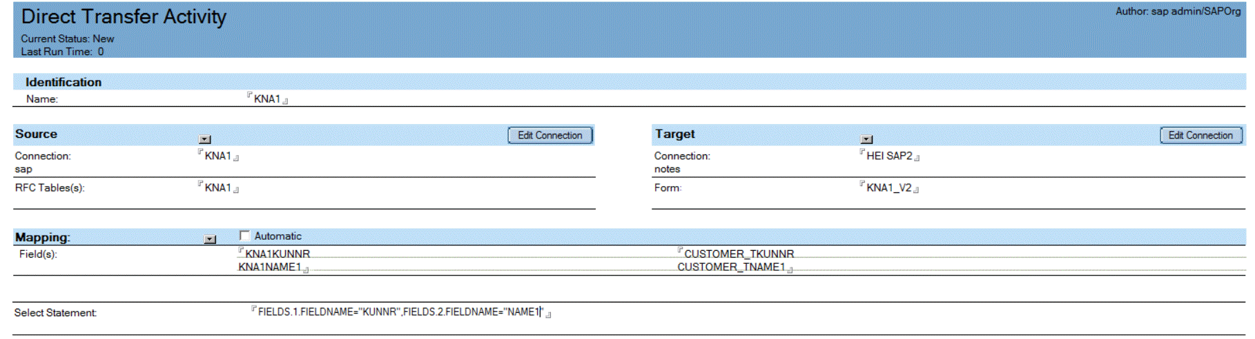 - Create a new Direct Transfer activity, and select your SAP connection document as the data Source.