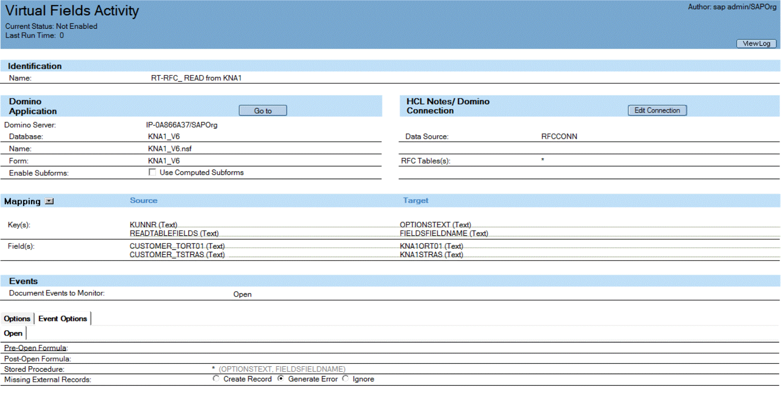 The object of a Virtual Fields activity is to match a key that you have in a Domino document with the data that you want from ECC. You want only a single record back. The only way to control the data that comes back from RFC_READ_TABLE is by entering values into the OPTIONS table of the call. The column TEXT in this table can contain query strings to uniquely identify the data that you want. However, there are issues that must be addressed.