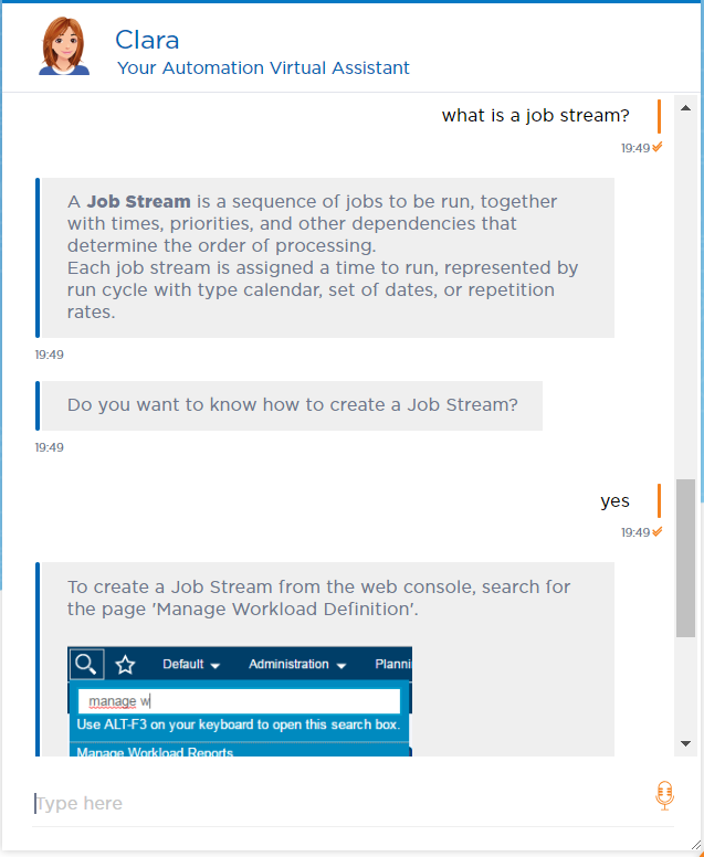 Clara can also help you understand the meaning of Workload Automation error messages: ask Clara "Search <error_message_code>, or "Search error <error_message_code>" to get an explanation of the error message you've received.