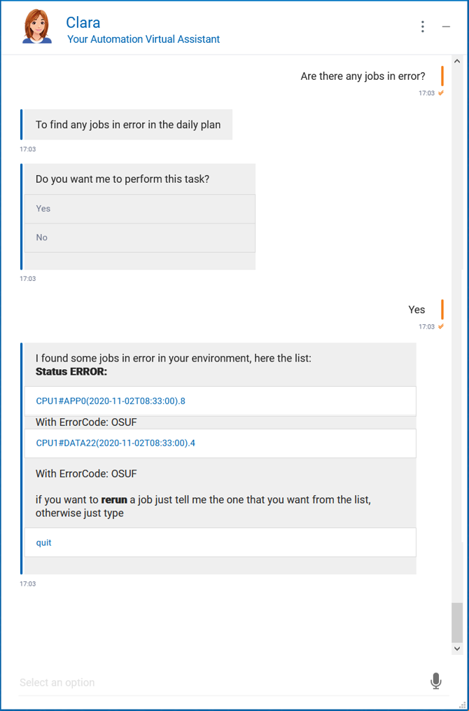 You can ask Clara if there are jobs in error. Clara will list all the jobs in error and ask you if you want to any.