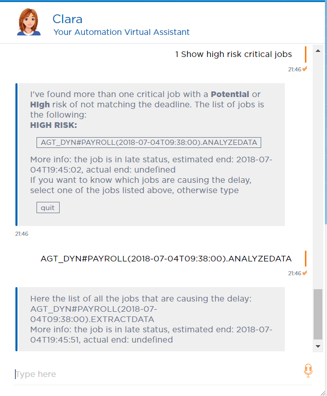 You can ask Clara why a job doesn't start. If the job doesn’t start because the job limit of the workstation is set to zero, Clara asks if you want to increase the limit. Also, Clara can recognize if the job doesn’t start because the agent is unlinked, stopped, if there are dependencies, or the job priority is set to zero. In all these situations, Clara asks if she can run an action for you, such as changing the priority, increasing the limit, and so on.