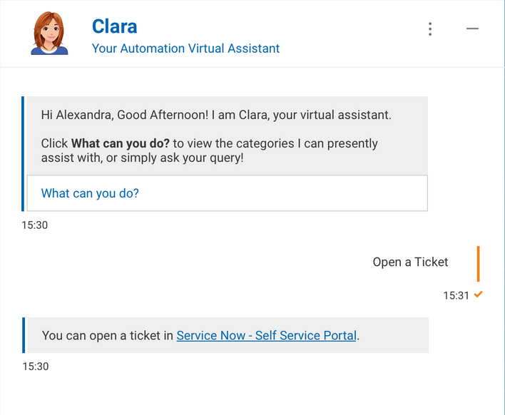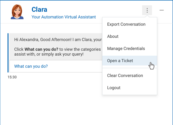 When you select this action, Clara provides you with a link to the Service Platform of your choice. You can open the same link by clicking Open a ticket in the menu on the upper right corner of Clara window.