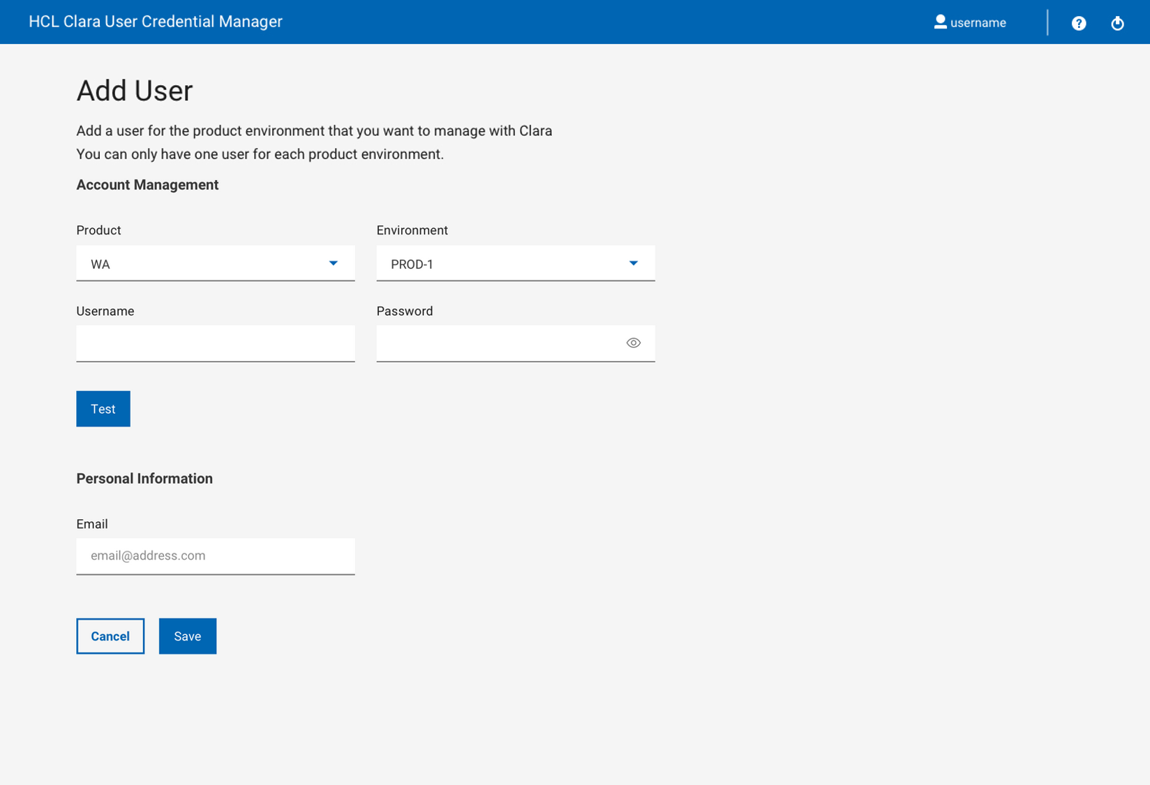 You can add a user for the product environment that you want to manage with Clara. You can only have one user for each product environment.