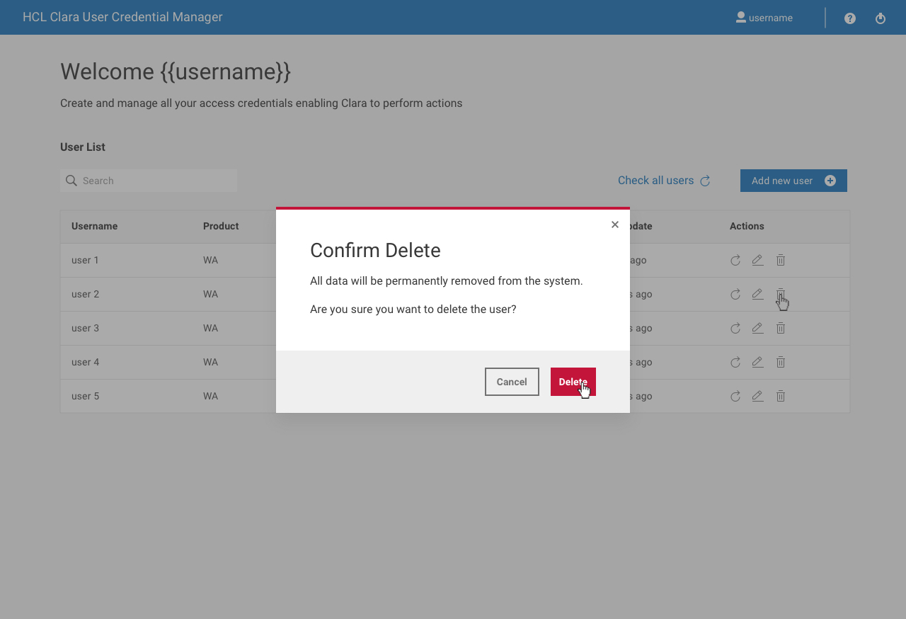 From the User Credential Manager main page, click the delete user action for the user you want to remove.
