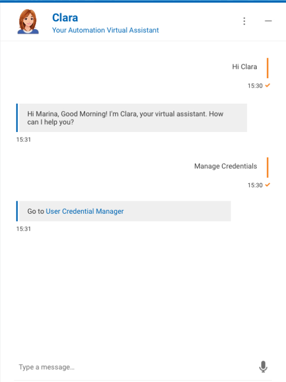 Moreover, when you ask Clara to run actions on your target environment but your credentials are not set, or not valid, Clara alerts you and provides the link to open the User Credential Manager interface.