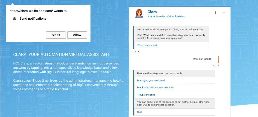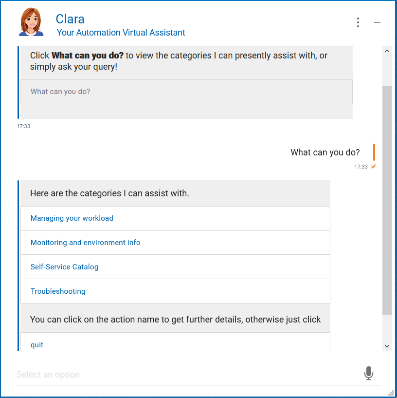 At Clara startup, by entering the "What can you do?" conversation flow, you can view the actions that Clara can run on your behalf.