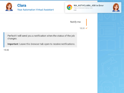 Leave the browser tab open. When the job status changes, Clara will send you a notification.