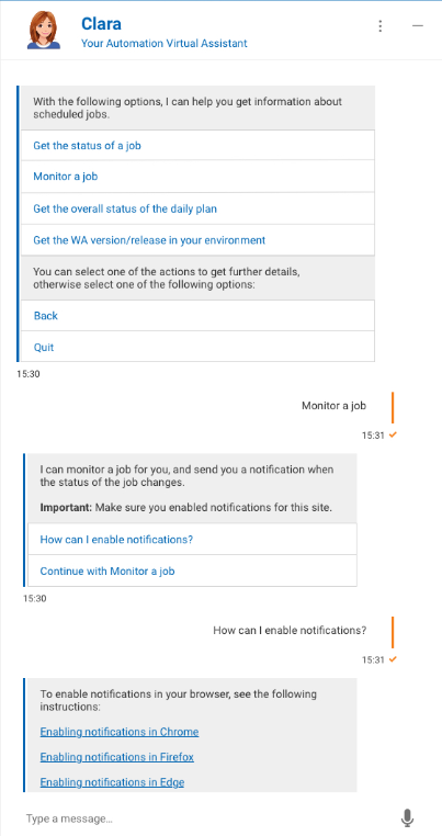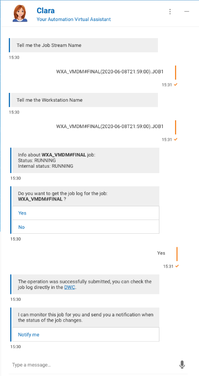 Clara checks the job status at time intervals, depending on the estimated duration of the job in Workload Automation, and notifies you when the job status changes. An e-mail with the new job status is also sent to the e-mail address you specified in the Add User flow, in the User Credential Manager interface.