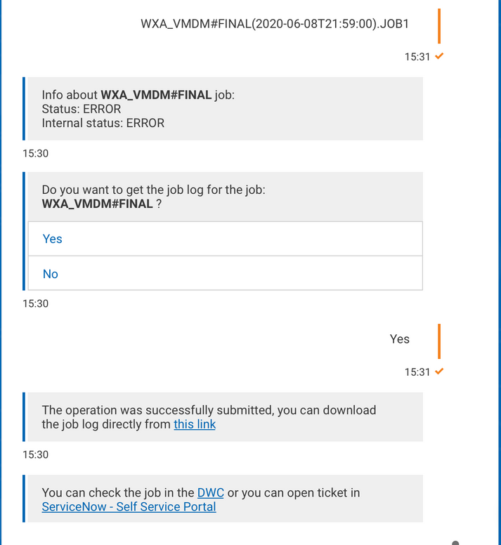 In the "What can you do?" conversation flow, select Monitoring and environment info > Monitor a job