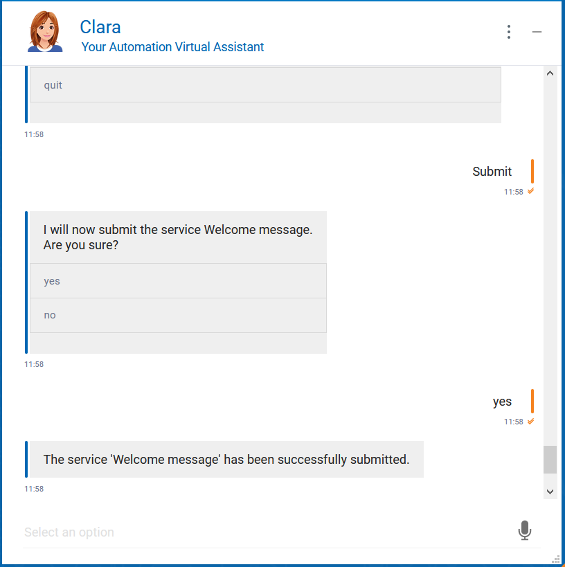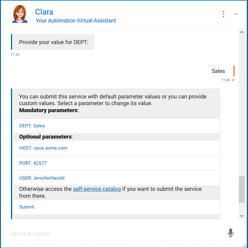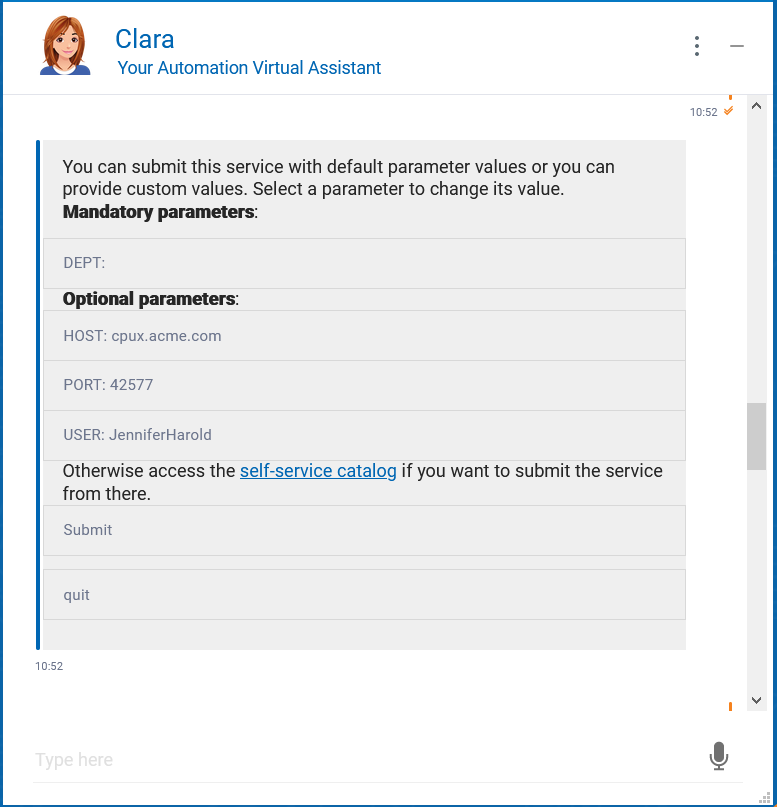 Click Submit to submit the service. When Clara asks for confirmation, click Yes. Also, Clara provides a link to the Self-service Catalog if you want to modify the parameters and submit the service from there.
