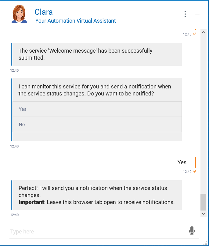 Clara can monitor the service execution for you and, optionally, can send you a notification when the service status changes. Click Yes to receive notifications.