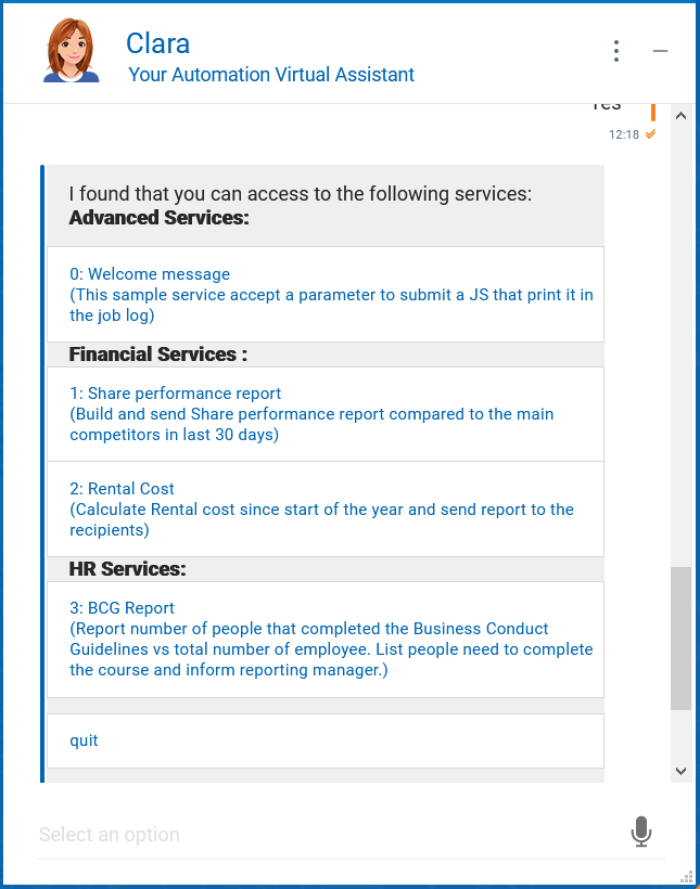 When you select this action, Clara shows the services available to you in the Self-service Catalog.