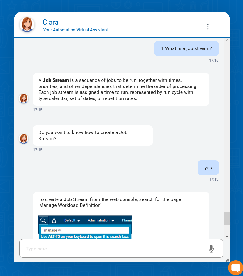Clara can also help you understand the meaning of Workload Automation error messages: ask Clara "Search <error_message_code>, or "Search error <error_message_code>" to get an explanation of the error message you've received.