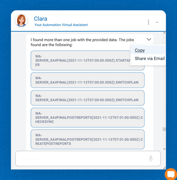 When chatting with Clara, by hovering over Clara's messages, options are available to Copy or Share via email the content of the message.