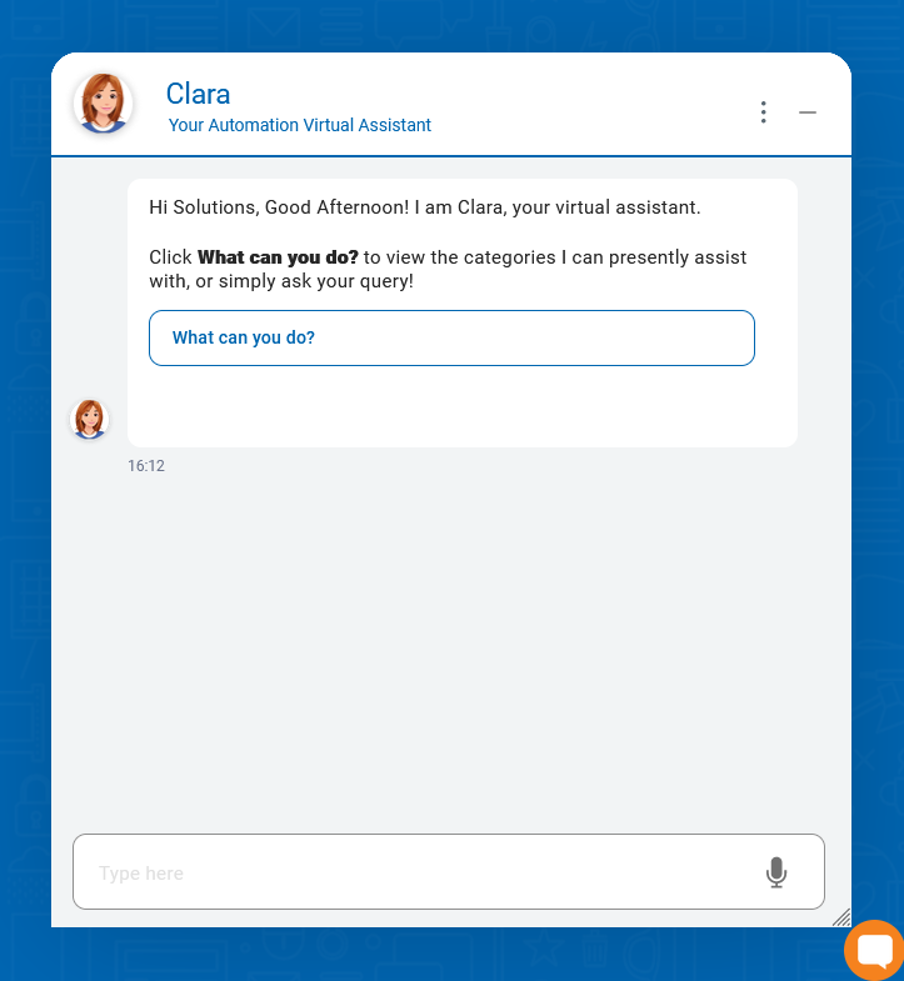 Ask Clara "What can you do?" to view the categories Clara can assist with. For an overview of the categories, see Running actions on your behalf.