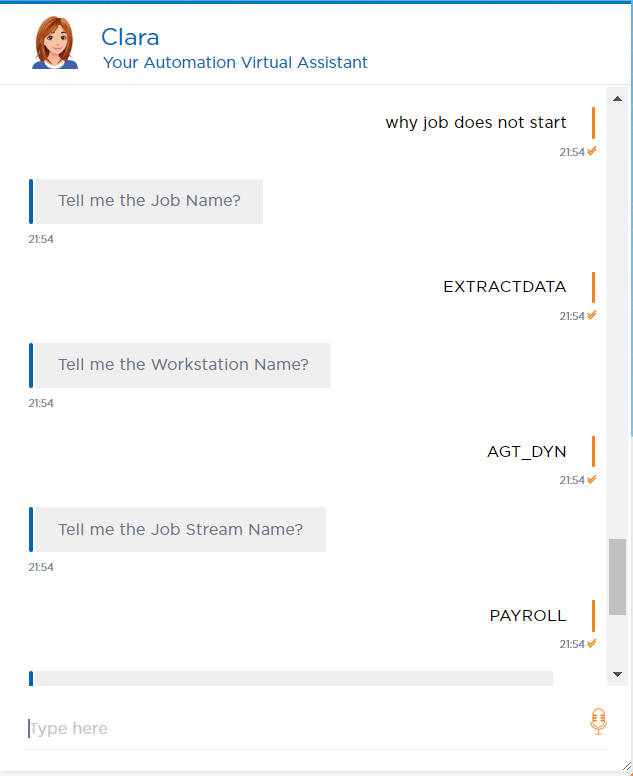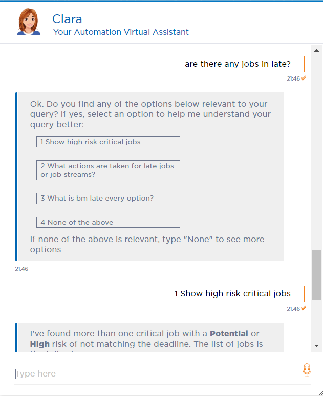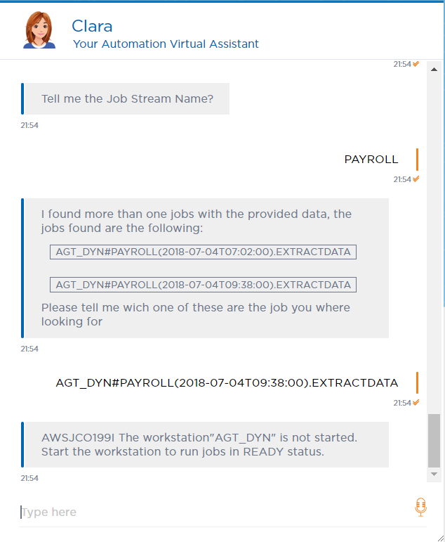 You can ask Clara why a job doesn't start. If the job doesn’t start because the job limit of the workstation is set to zero, Clara asks if you want to increase the limit. Also, Clara can recognize if the job doesn’t start because the agent is unlinked, stopped, if there are dependencies, or the job priority is set to zero. In all these situations, Clara asks if she can run an action for you, such as changing the priority, increasing the limit, and so on.